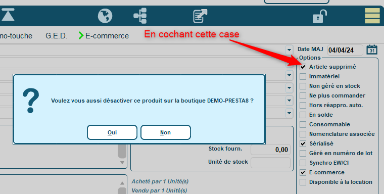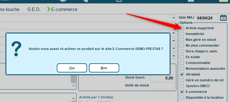 A l’inverse, en décochant la case , Codial vous posera la question pour ré-activer le produit sur le site ou non :